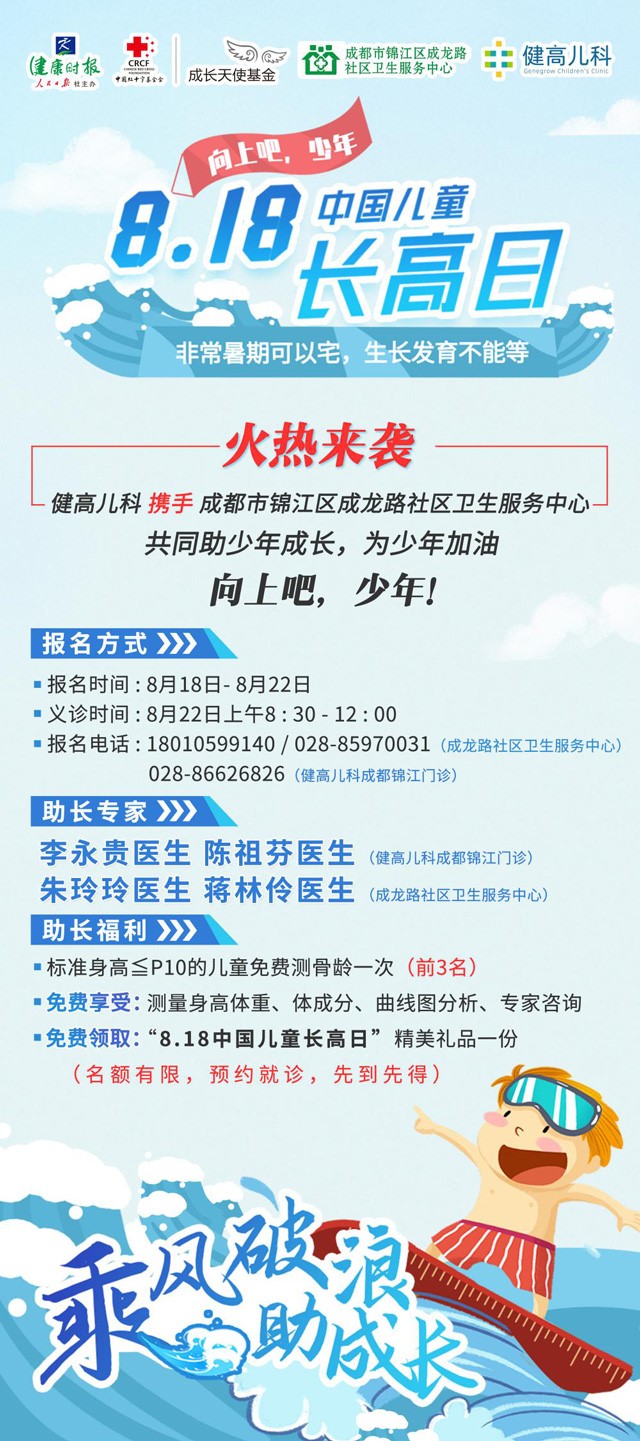 “8.18中国儿童长高日”暑期儿童生长发育科普系统活动邀请 成都市锦江区成龙路社区卫生服务中心 和 健高儿科联合义诊,一起携手助力健康中国行动!